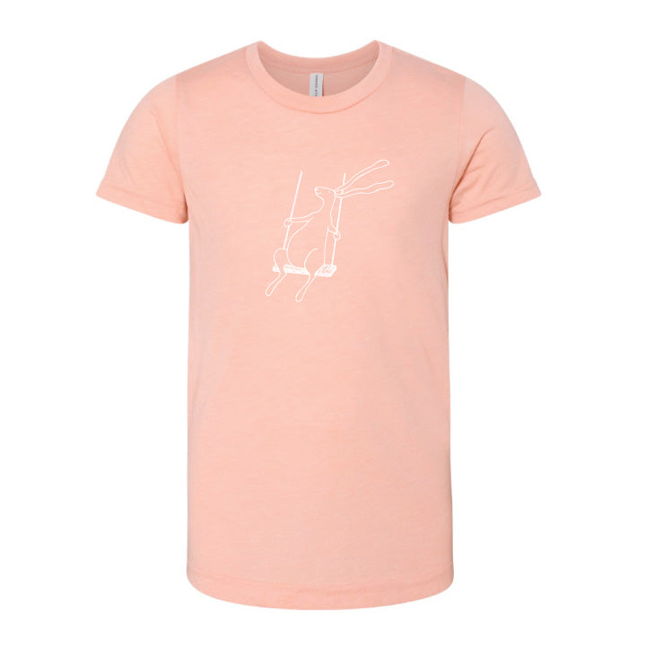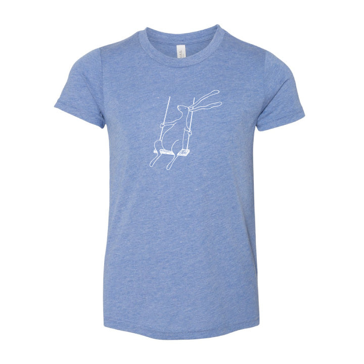 Our bunny on a swing is hand screened in white on heather blue or heather peach, youth short sleeve, triblend shirt.