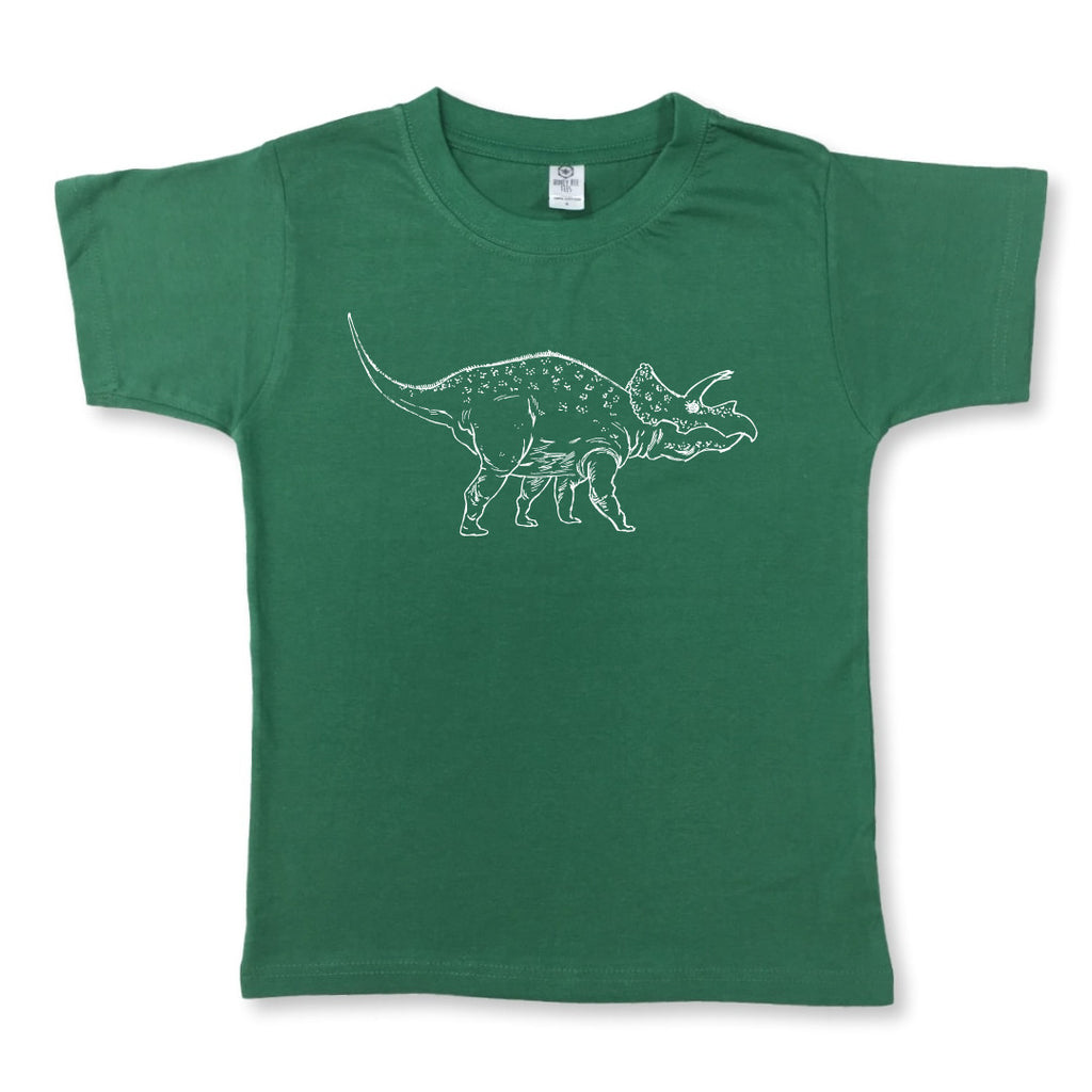 Our triceratops dinosaur is hand screened in white on a super soft, short sleeve, green or light pink tee.