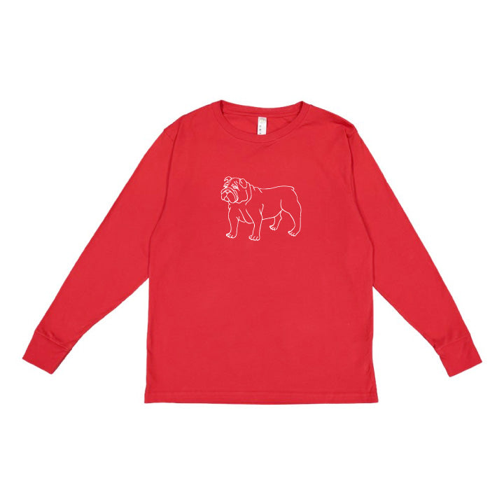 Our simple bulldog design is hand screened in white on a red, long sleeve cotton, youth t-shirt.