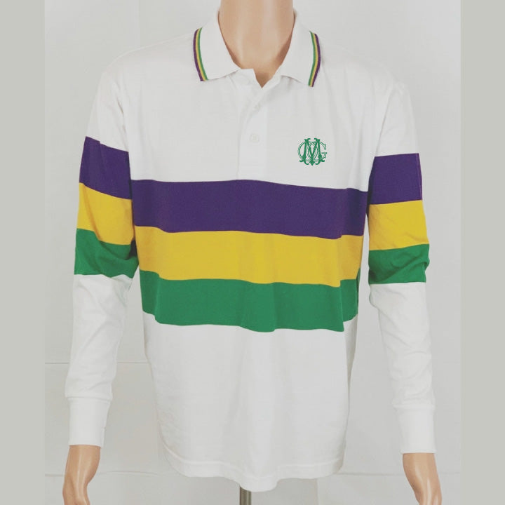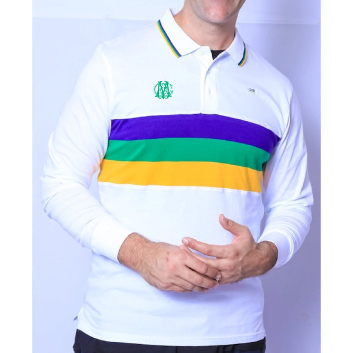 A 100% heavy weight white cotton polo shirt with PGG stripes on chest. The colorful stripes are woven in fabric. It is not printed shirt.