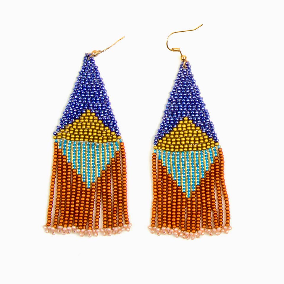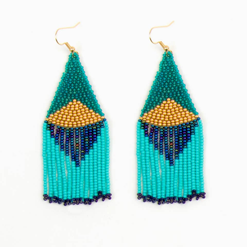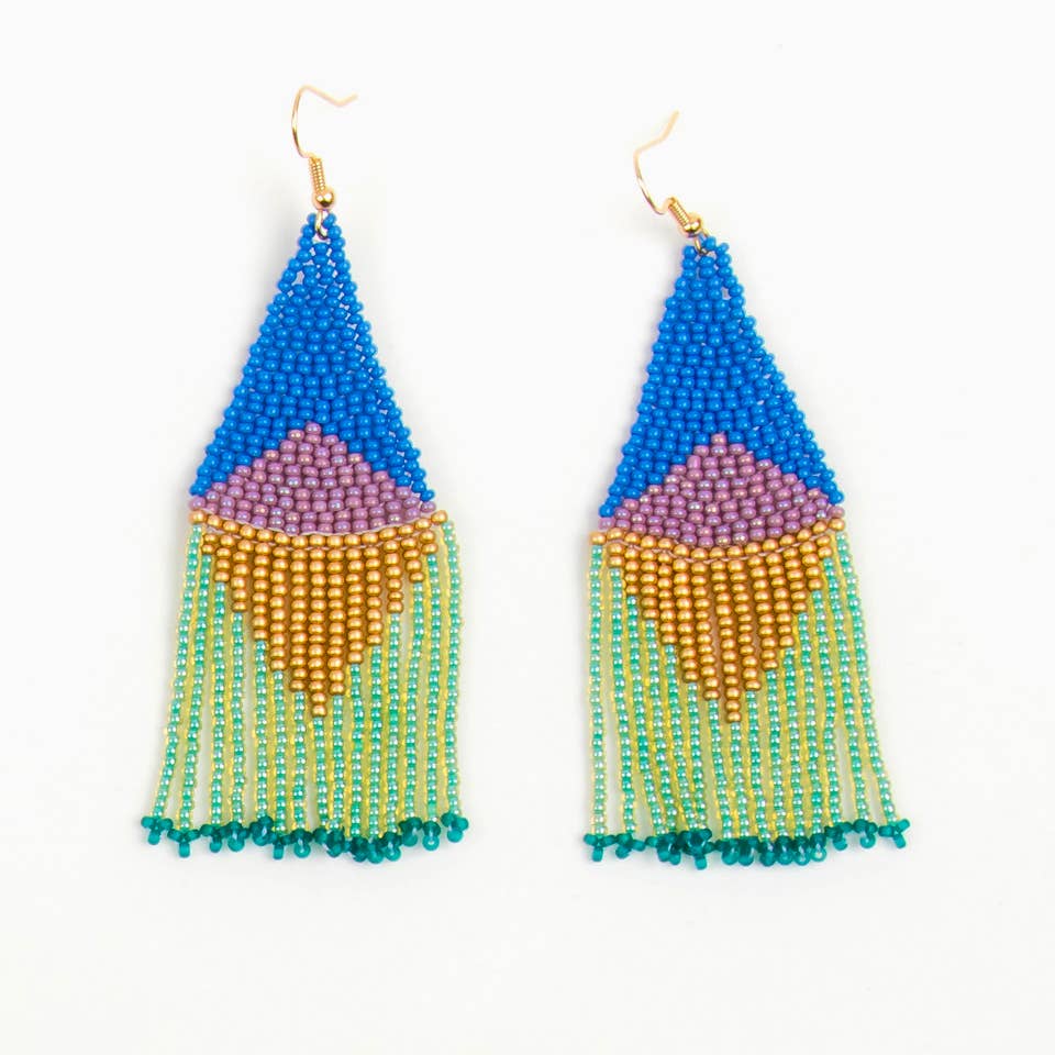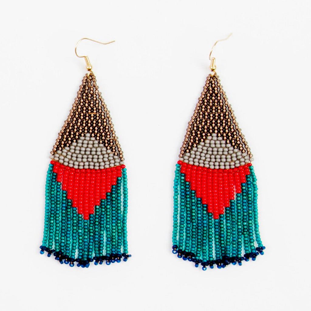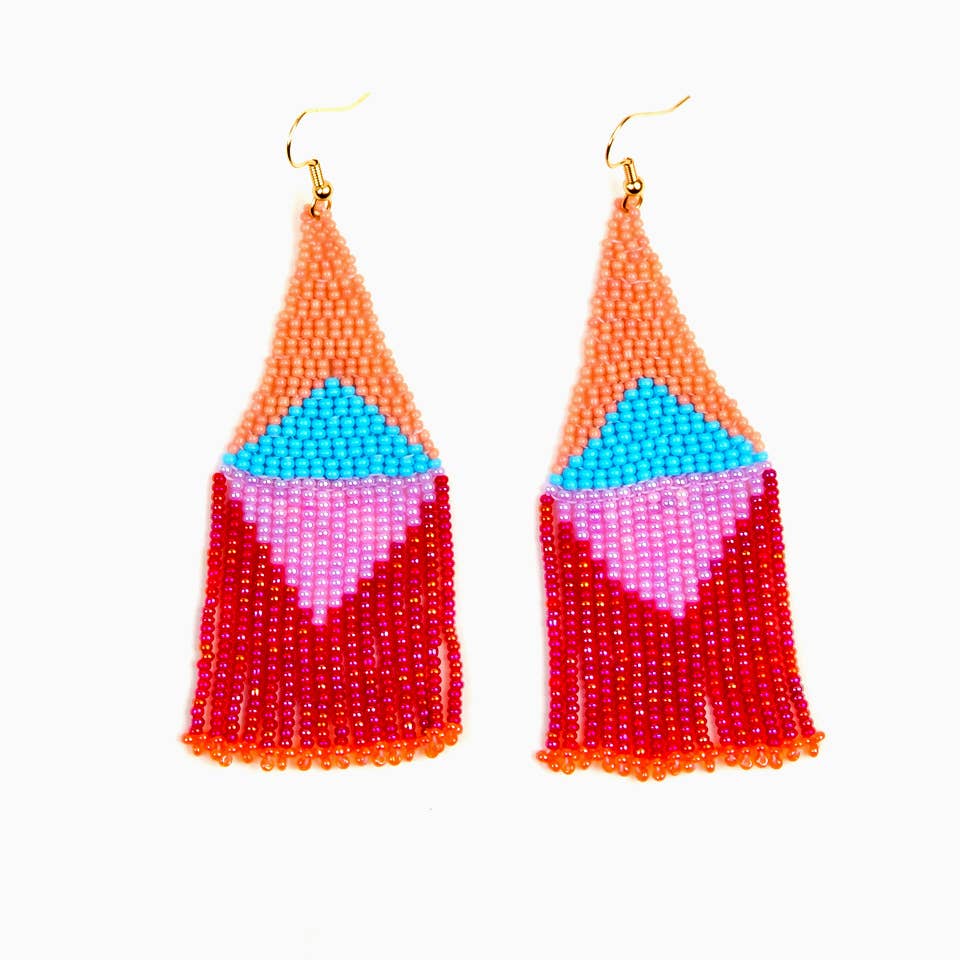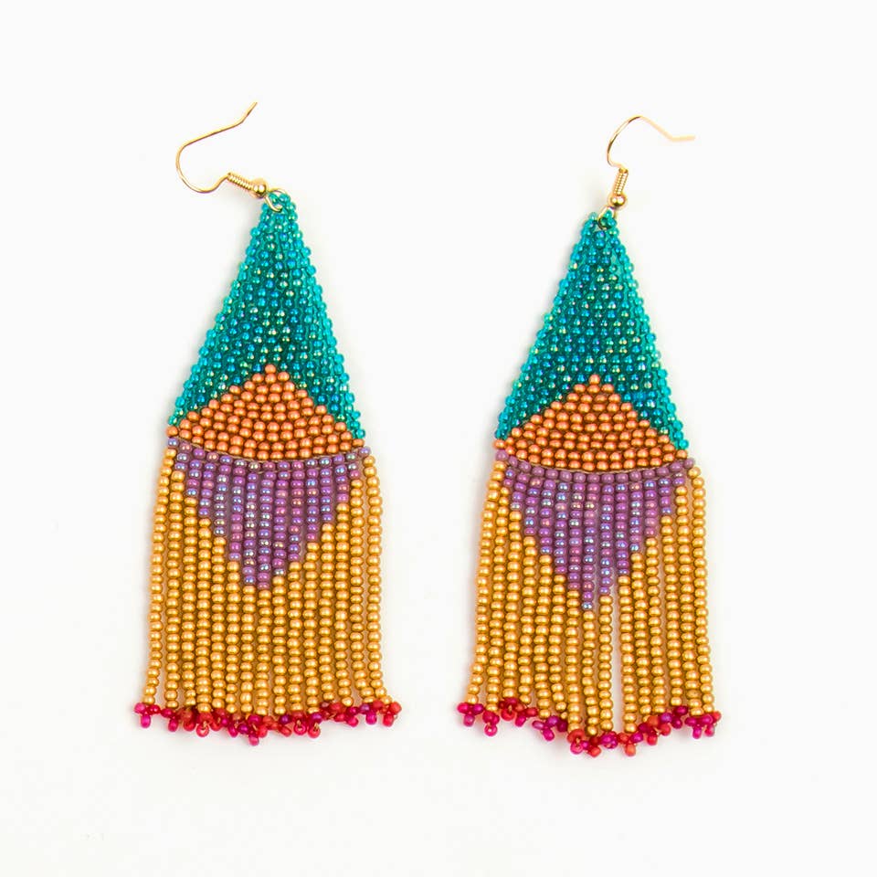 The beaded graphic fringe earring is a seriously eye-catching piece with its bold blocks of color and fun beaded fringe. 3" long. Glass seed beads and gold plated french ear wires. The graphic fringe beaded earring is handmade in a fair trade workshop in Guatemala.