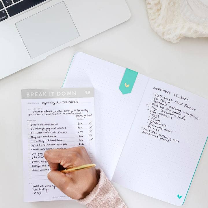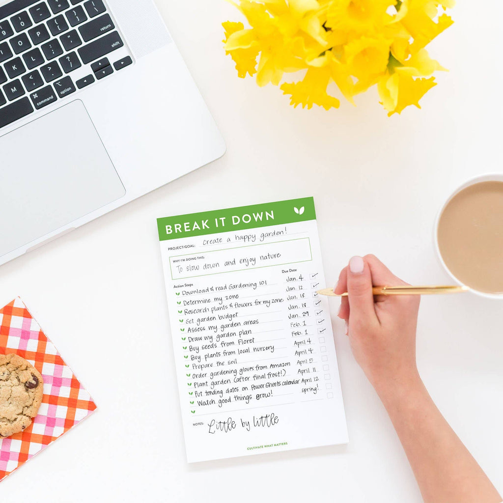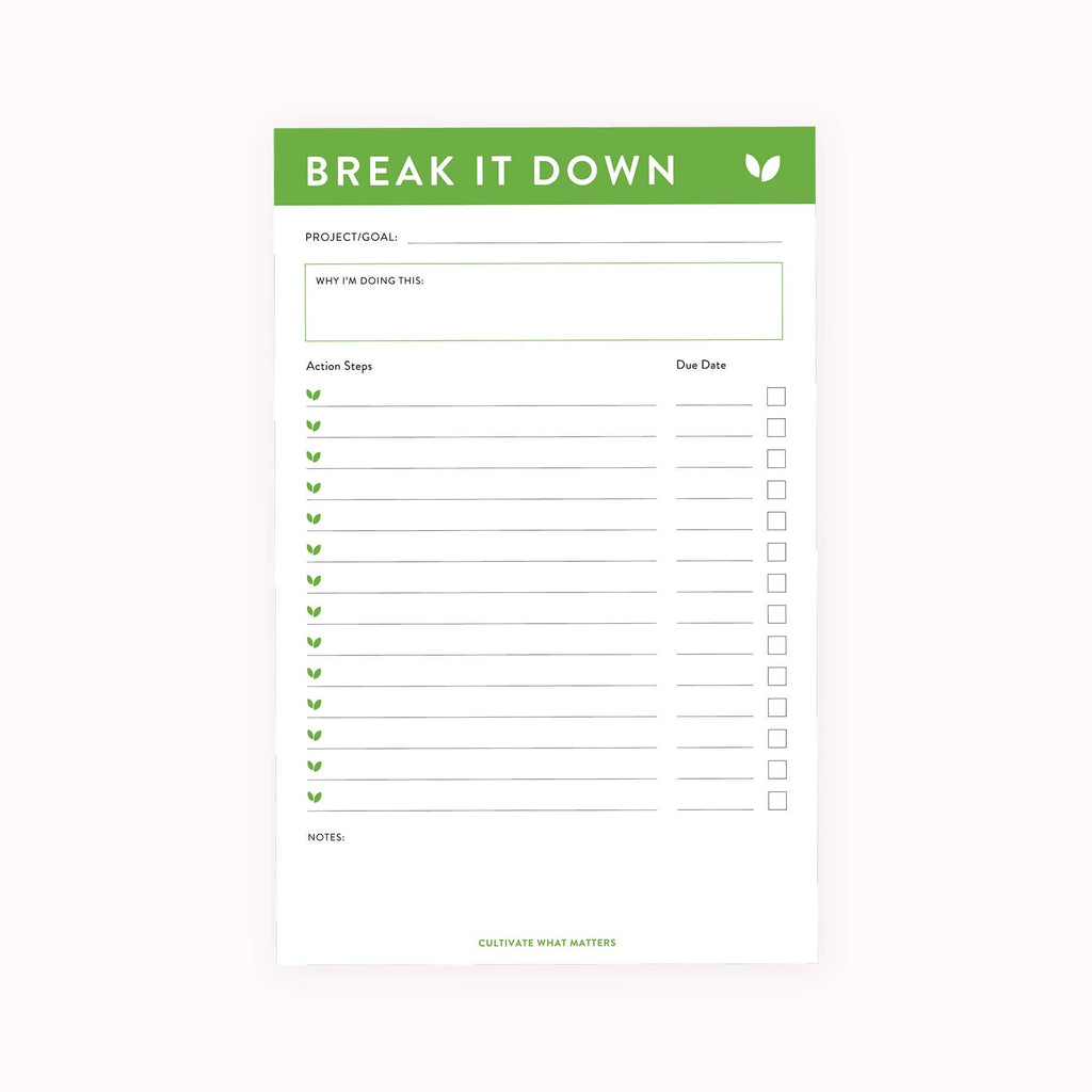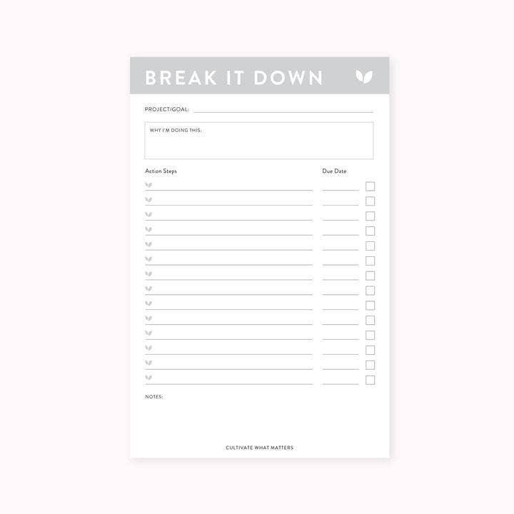 Instead of feeling overwhelmed, you'll move forward and want to keep going. Watch your small actions, little by little, add up to big progress with the Break It Down Notepad. It provides you with plenty of space to note the steps to take to accomplish any project or goal you have.