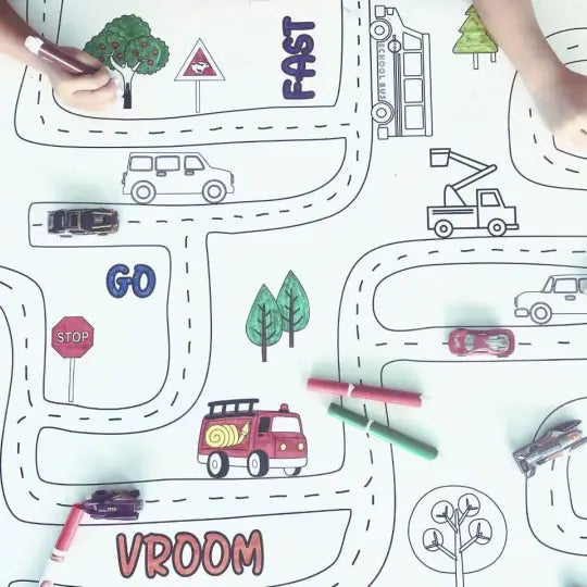 π This giant 36" x 72" Road Map play mat is printed on premium 20lb matte white paper so you and your child can both play with your cars on the roads as well as color the scene along the way!