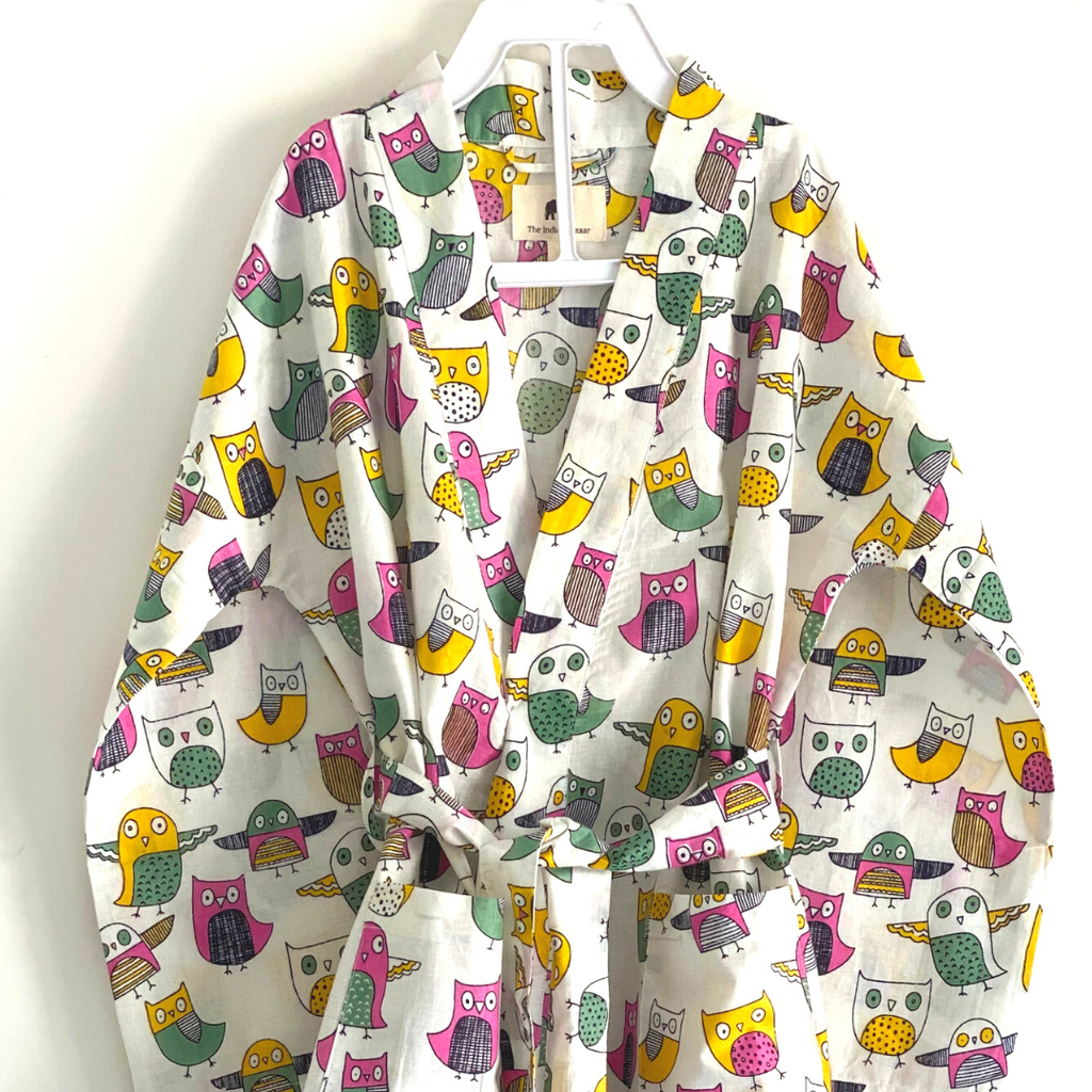 Charming cotton hand block prints especially hand picked for little kids. Quirky White owls print on white kids robe Flattering for most body types. Light weight breathable cotton. This robe comes with matching bag Garment measurement sizing for relaxed fit : 3T : chest - 13 inches ; length - 21.5 inches 4T : chest - 14 inches ; length - 23.5 inches 5T : chest - 15 inches ; length - 25.5 inches 6T : chest - 16 inches ; length - 27 inches 7T : chest - 17 inches ; length - 30 inches 8 : chest - 18 inches ; length - 30 inches Features : - belt and belt loops - full sleeves - hanger loop - pockets Fair Trade and Handmade by Women Artisans in India