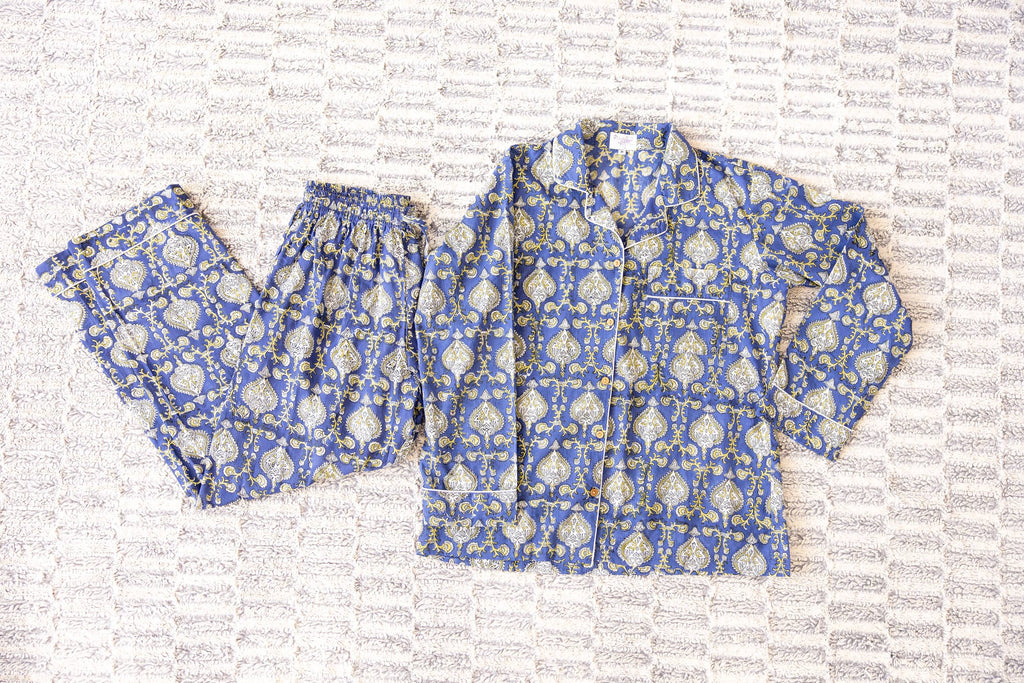 The set includes a button-down shirt, 100% cotton pants with an elastic waistband and drawstring, and a matching bag. Sizing for this handmade ensemble is approximate and varies slightly, and it is available in sizes S, M, L, XL. The fabric is hand-block printed cotton, and it is recommended to wash by hand or on a gentle cycle and to tumble dry on low.