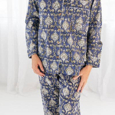 Slip into a cozy cotton pajama pant set as you start to prepare for your day or as you unwind for the night. The soothing deep navy and sage green adds a touch of tranquility to your routine.