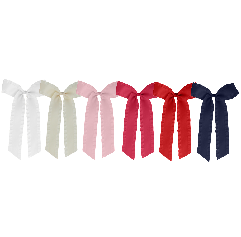 Adorable hand tied satin long tail bow on a clippie. Tail measures 7” from center