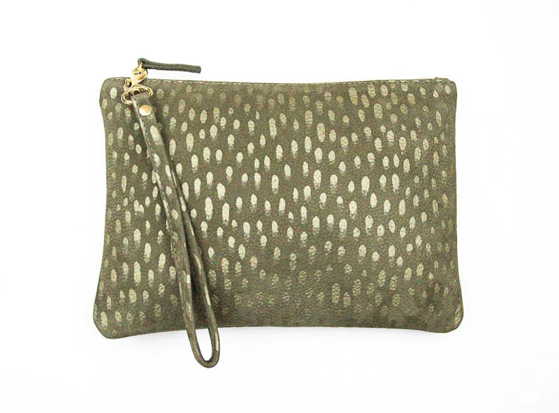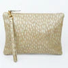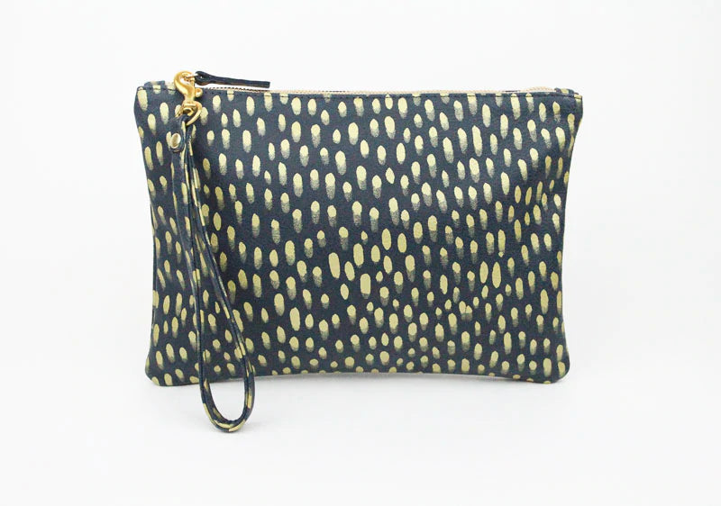 This clutch is made out of genuine Italian leather that has been hand-screened in metallic gold 'Gerty's Dot' and is lined with 100% cotton duck fabric hand-screened in 'Ripple'.