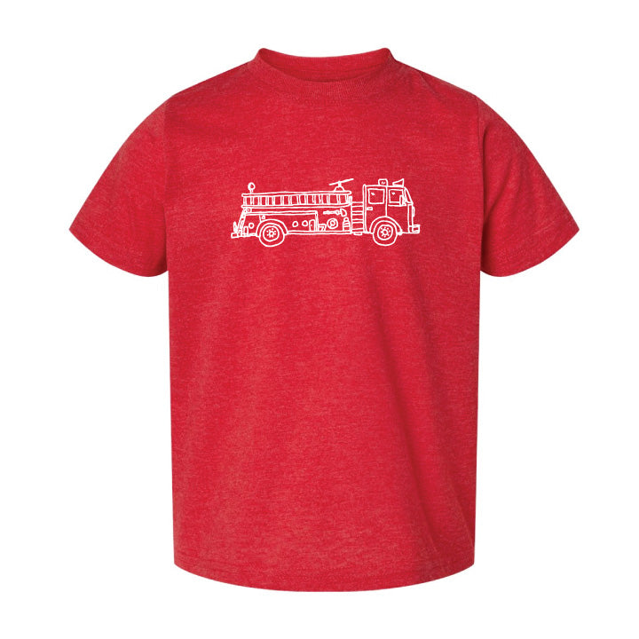 Can you hear it's siren? This simple fire truck is hand screened in white on a super soft, high quality, lightweight {4.3 oz} cotton, classic red, fine jersey t-shirt.