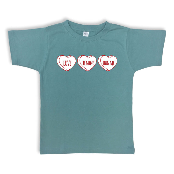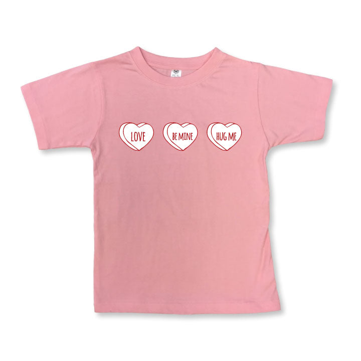 Our candy hearts design is hand screened in white and red on a light pink short sleeve t-shirt.